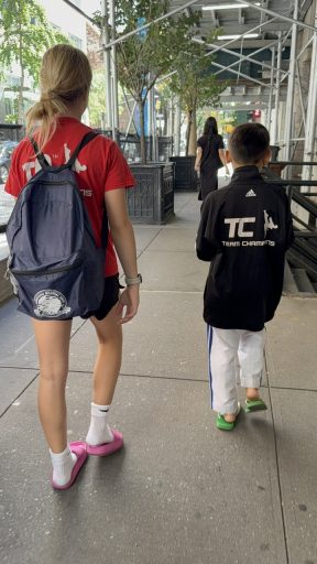 Comme il faisait un temps magnifique je suis allée me promener vers la promenade de Brooklyn Heights le temps qu’Ellie s’entraîne et une fois l’entraînement terminé, nous sommes rentrées avec deux autres masters vers la maison. Je leur avais proposé de nous arrêter à la pharmacie pour l’une des deux qui a une angine et ne savait pas quel(s) médicament(s) acheter pour calmer ses maux de gorge (il faut dire qu’il y a de quoi en perdre son latin tellement le choix est vaste). Nous sommes arrivées à la maison pile au moment où Master Yoo et Master Hyun fermaient le dojang. Ellie était impressionnée par le timing parfait (et moi encore plus!). Nous avons un peu papoté devant le dojang avant que chacun ne rentre chez soi. Chris est ensuite allé faire quelques courses avec tata Liz, Maisie et Mila pendant qu’Ellie s’est préparée parce qu’elle était invitée à sa première Bar Mitzvah. Entre temps, Master Hyun est venu nous surprendre et nous a livré un plat coréen (nous en parlions justement un peu plus tôt); c’était super gentil (et surtout excellent!!!).
